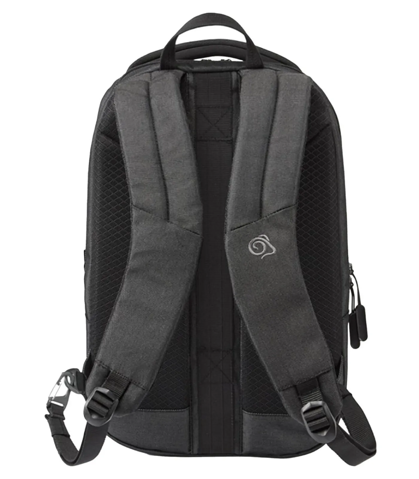 Craghoppers Anti–Theft Zwarte Rugzak bevat een verzameling van unieke eigenschappen die de perfecte keuze maken voor een veilige en functionele reizendossier. Dit zakje is gemaakt van 900D polyamide, polyester en PU–coating, waardoor het snijbestendig en waterafstotend is. Het gebruikt DWR Finish en EcoShield technologie om te voorkomen dat het zakje nat raakt en het vervuilt wordt door regen of vuil. De rugzak heeft een logo–ontwerp, bevestigd met clip en ritssluiting. De schouderriem is verstelbaar, terwijl de Anti–Tamper Zip en Anti–Theft functies ervoor zorgen dat uw dossier veilig is. Het zakje heeft ook een Cafe Strap, Carry Handle, Headphone Ports en Cable Tidy Tab voor praktische gebruik. Daarnaast is het zakje gepadded en heeft reflectieve details om betere visibiliteit te bieden bij nachtelijke wandelingen. De Webbing Shoulder Strap en Wheeled Luggage Handle Strap maken het gemakkelijker om dit zakje mee te nemen tijdens reizen. Het dossier heeft een hoofdcompartiment en een compartiment met rits, waardoor er genoeg ruimte is voor alle benodigde items. Het heeft ook een gaaszak, een voorzak, een rits zakje en een RFID–blokkerende zakje voor extra veiligheid. De rugzak is gemaakt van hergebruikt materiaal en heeft een capaciteit van 18L, waardoor het perfect geschikt is voor een laptop met een scherm van 13 inch. Met een maat van 50 x 27 x 19 cm is dit zakje gemakkelijk mee te nemen op elke reis.