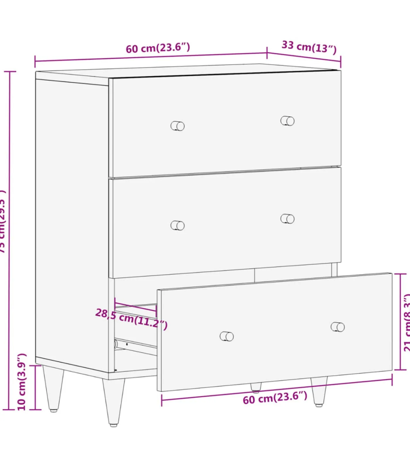 Massief mangohout: massief mangohout is een sterk, tropisch hardhout waar stevige meubelen van gemaakt worden. De prachtige houtnerven maken elk meubelstuk net even anders dan de rest. De kast is van massief mangohout gemaakt en is duurzaam en stabiel.
