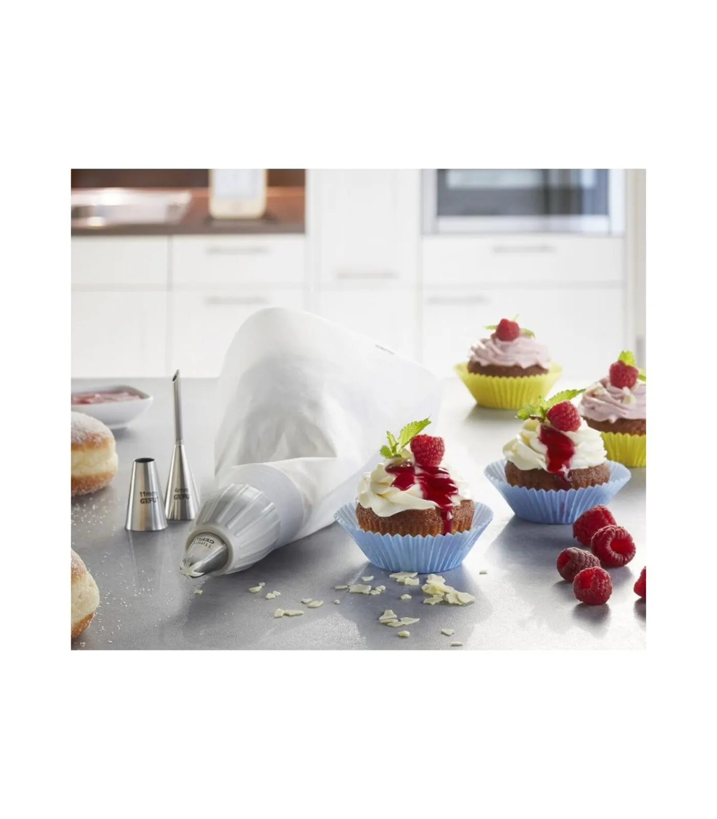 • voor het versieren van gebak, koekjes en andere desserts• voor het vullen van Berlinerbollen en beignets, muffin– of donutvormen • spuitzak van gecoat, kookbestendig katoen• kunststofadapter voor grote en kleine tuiten• 3 tuiten van hoogwaardig roestvrij staal