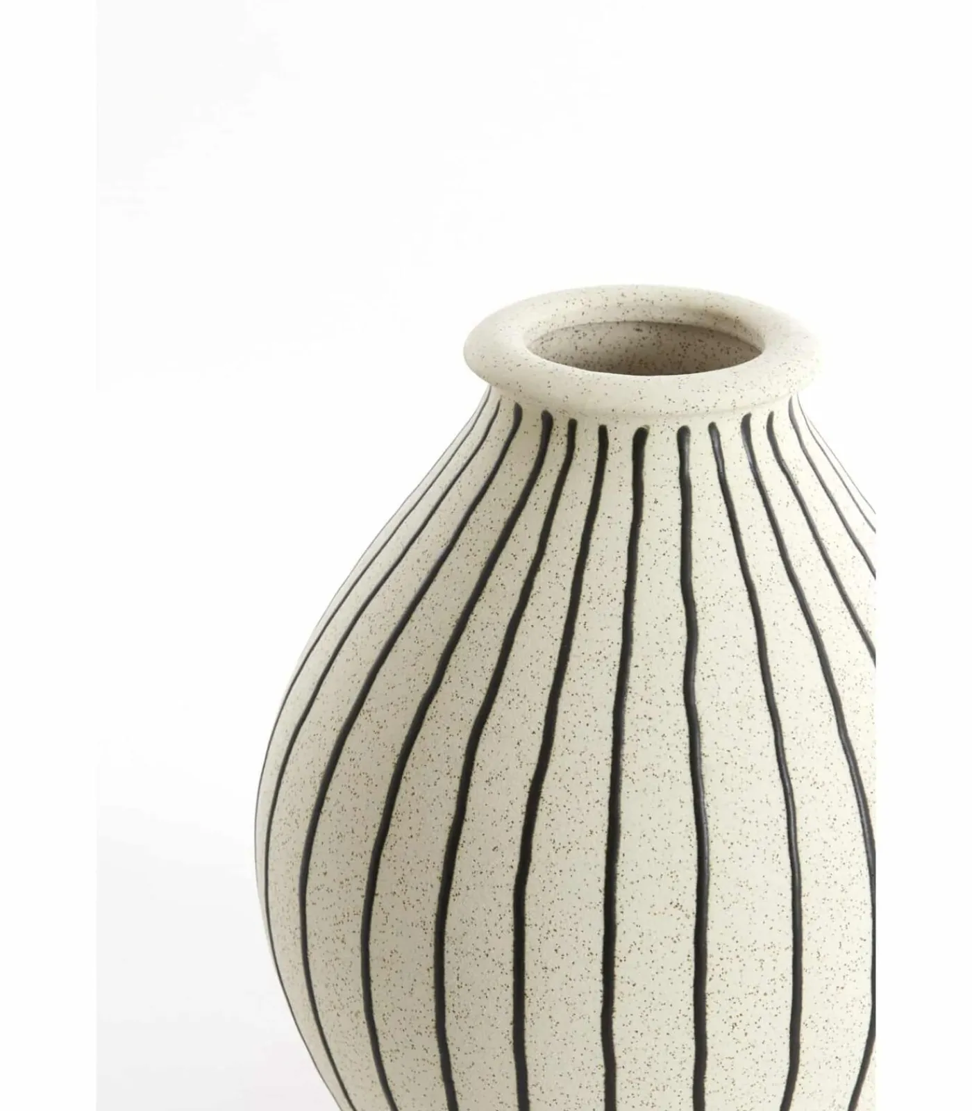 Breng een kunstzinnige flair in je interieur met de Diphu vaas van Light & Living. Deze keramieken vaas combineert een zachte crèmekleurige basis met handgeschilderde zwarte strepen, waardoor elk exemplaar uniek is. Met zijn elegante ellipsvorm en slanke hals is de vaas een stijlvolle blikvanger die zowel met als zonder bloemen een statement maakt. De vaas is vervaardigd uit hoogwaardig keramiek en heeft een matte afwerking die zorgt voor een natuurlijke uitstraling. De handgeschilderde zwarte strepen geven de vaas een artistiek karakter, waardoor hij perfect past in diverse interieurstijlen. Plaats de vaas op een dressoir, vensterbank of als middelpunt op de eettafel en laat je ruimte tot leven komen. De vaas heeft een diameter van 23 centimeter en is 29 centimeter hoog.