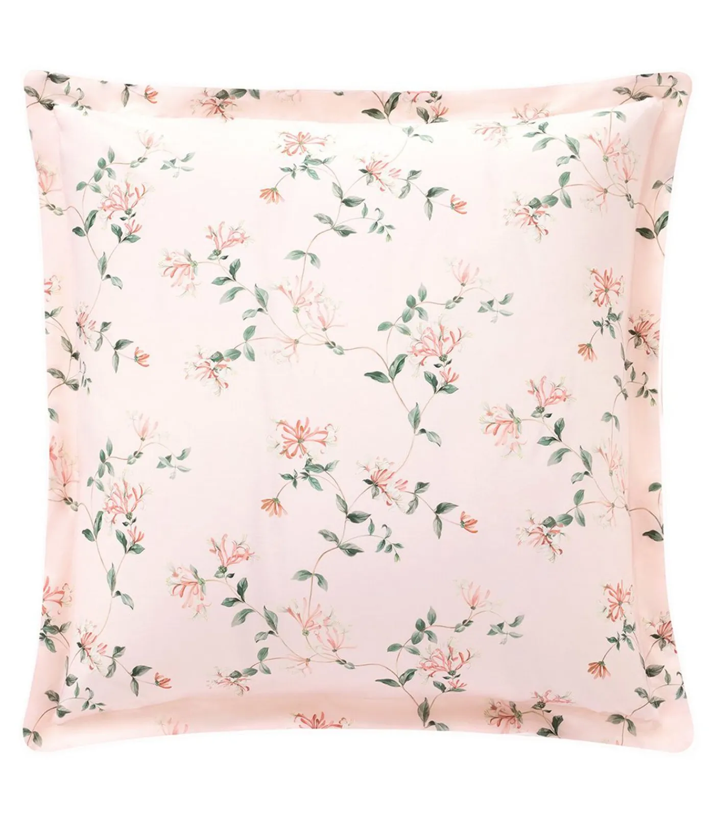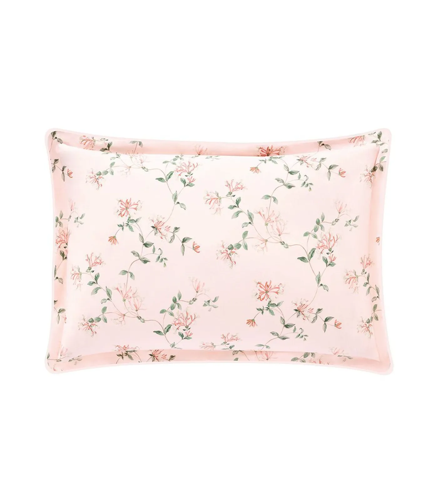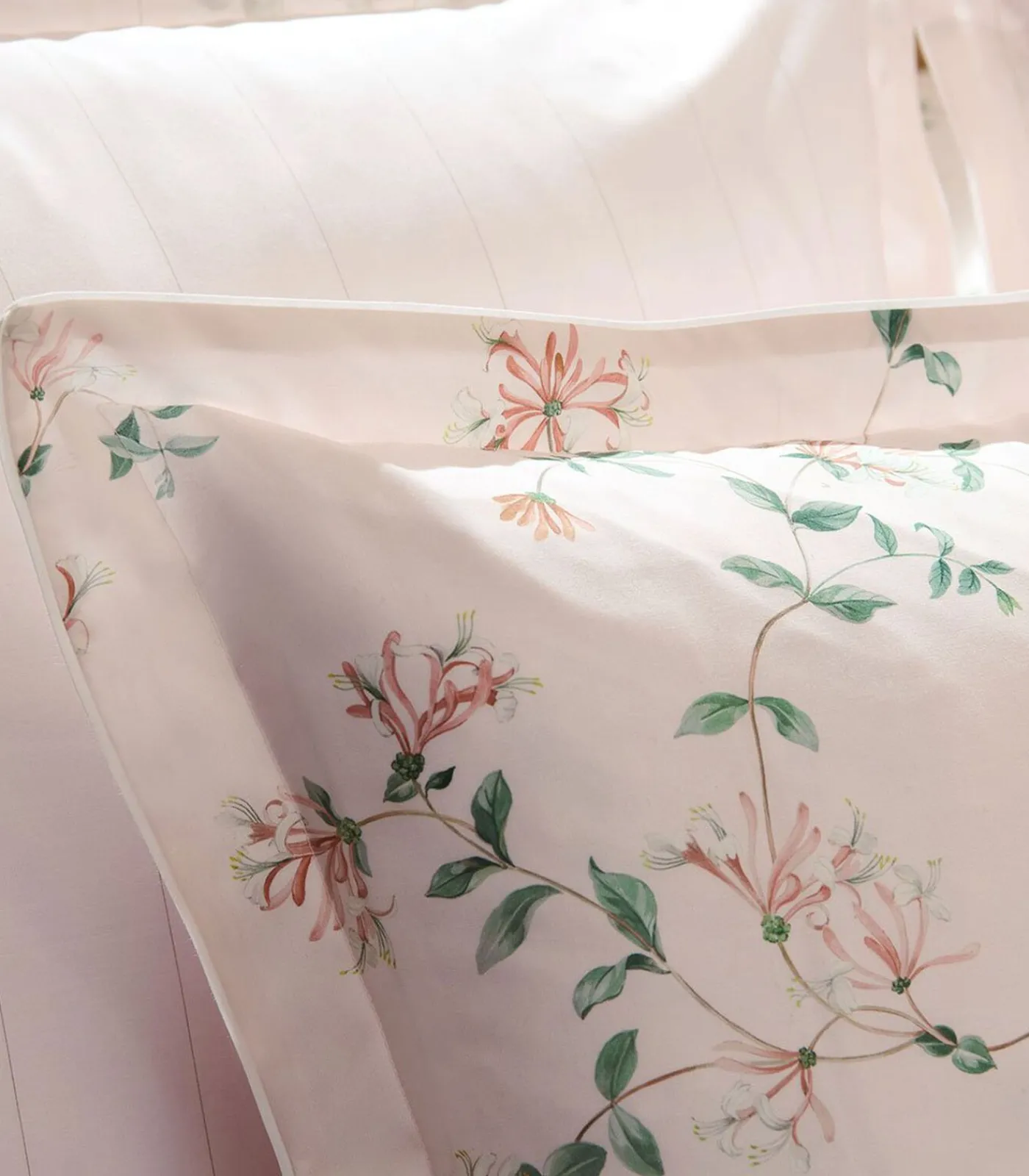 Print van kamperfoelie bloemen op poederroze achtergrondPrint van fijne verticale strepen op poederroze achtergrond