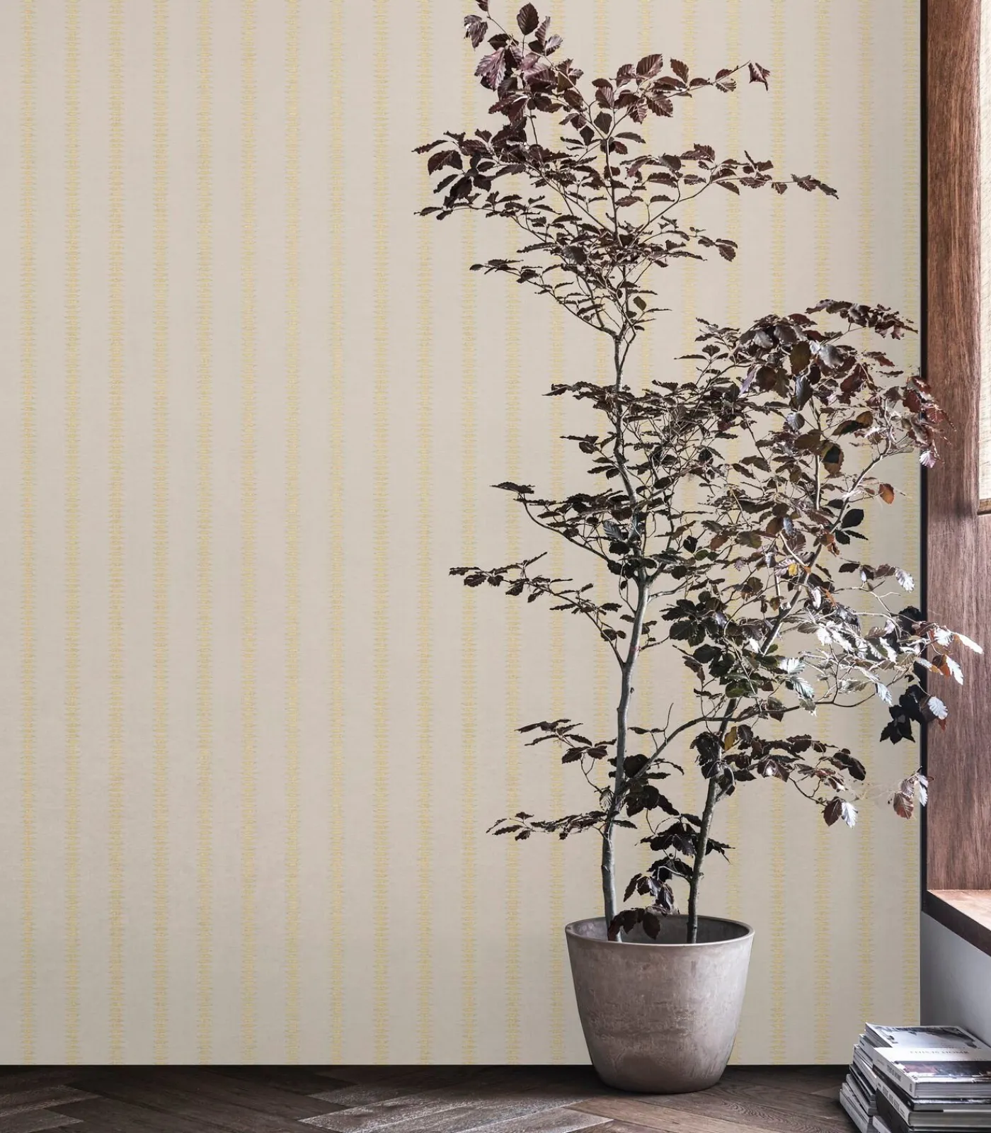 Het Gold Diamond Flax behang is geïnspireerd op de prachtige eenvoud van vlasvezels en combineert dit met de schittering van goud. Het patroon van gouden smalle strepen creëert een subtiel en toch opvallend design dat de ruimte een gevoel van diepte en dimensie geeft. De goudtinten weerkaatsen het licht op een unieke manier, waardoor een warme en uitnodigende ambiance ontstaat.