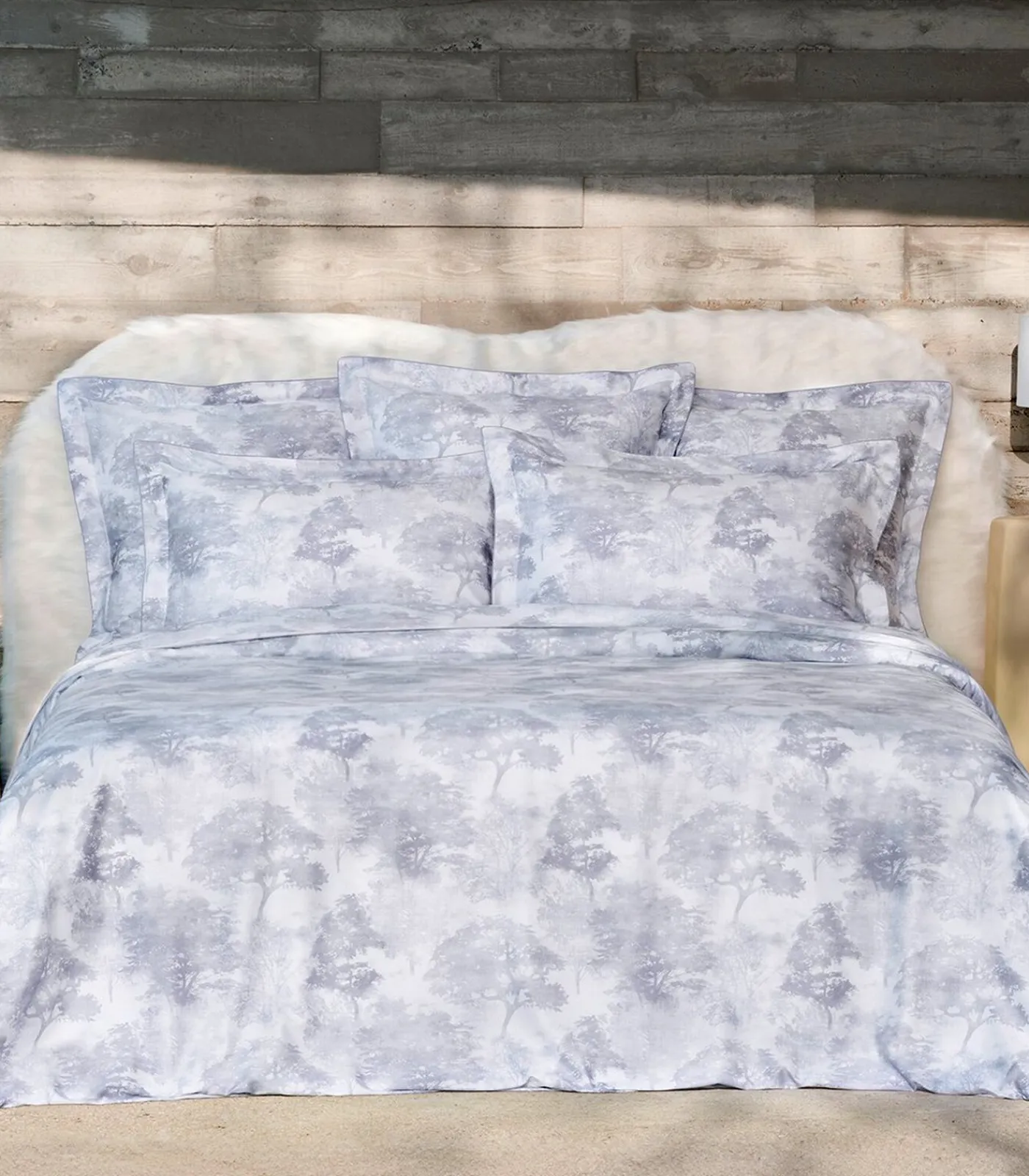 Voor– en achterkant bedrukt met aquarelgrijze en blauwachtige esdoornbladeren