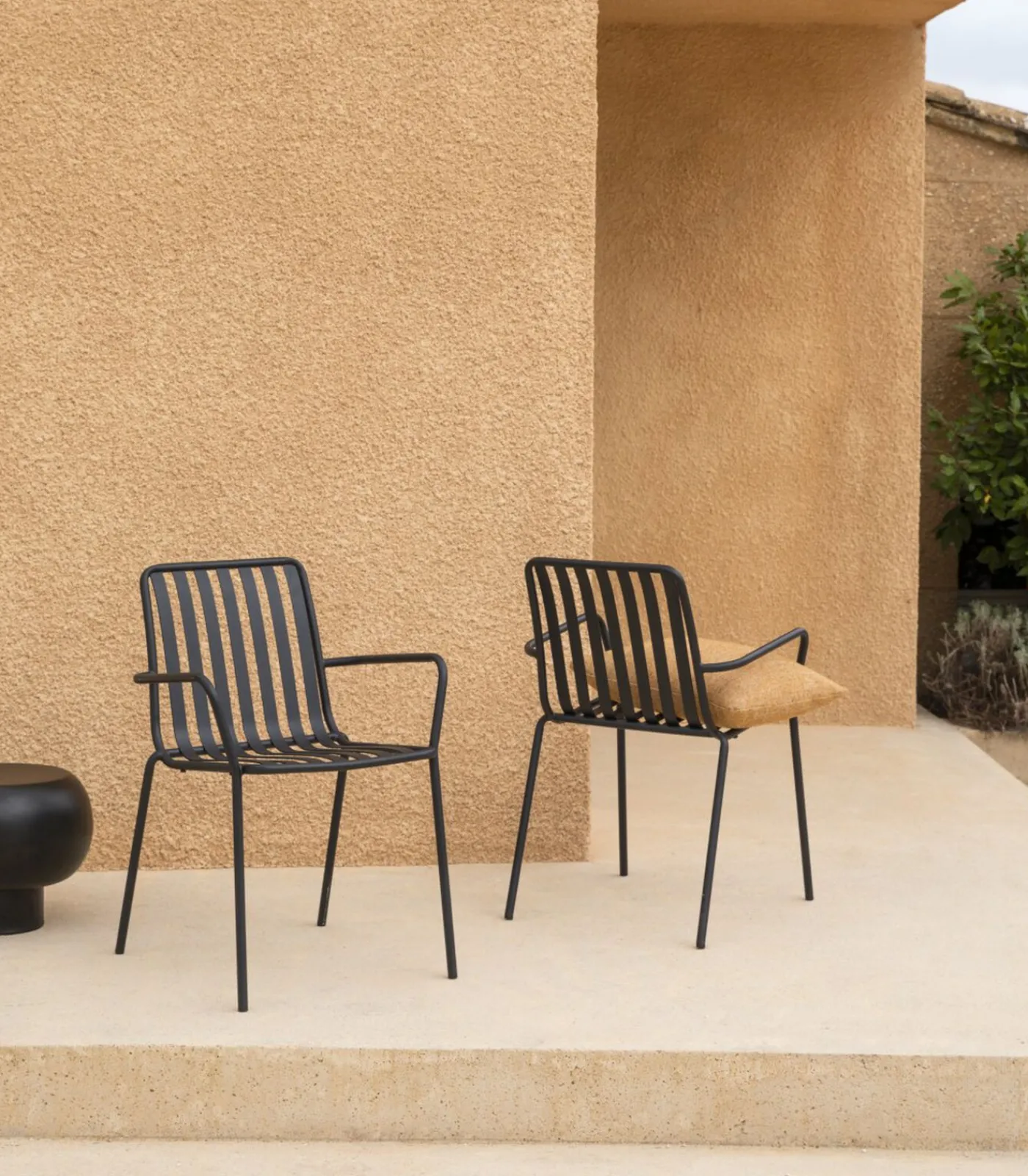 De zwarte metalen stoel Gaby is ook verkrijgbaar in wit en oranje. Om een tuinsalon vol persoonlijkheid te creëren, kun je deze tuinstoel afwisselen met bijpassende zwart metalen Gaby–stoelen.