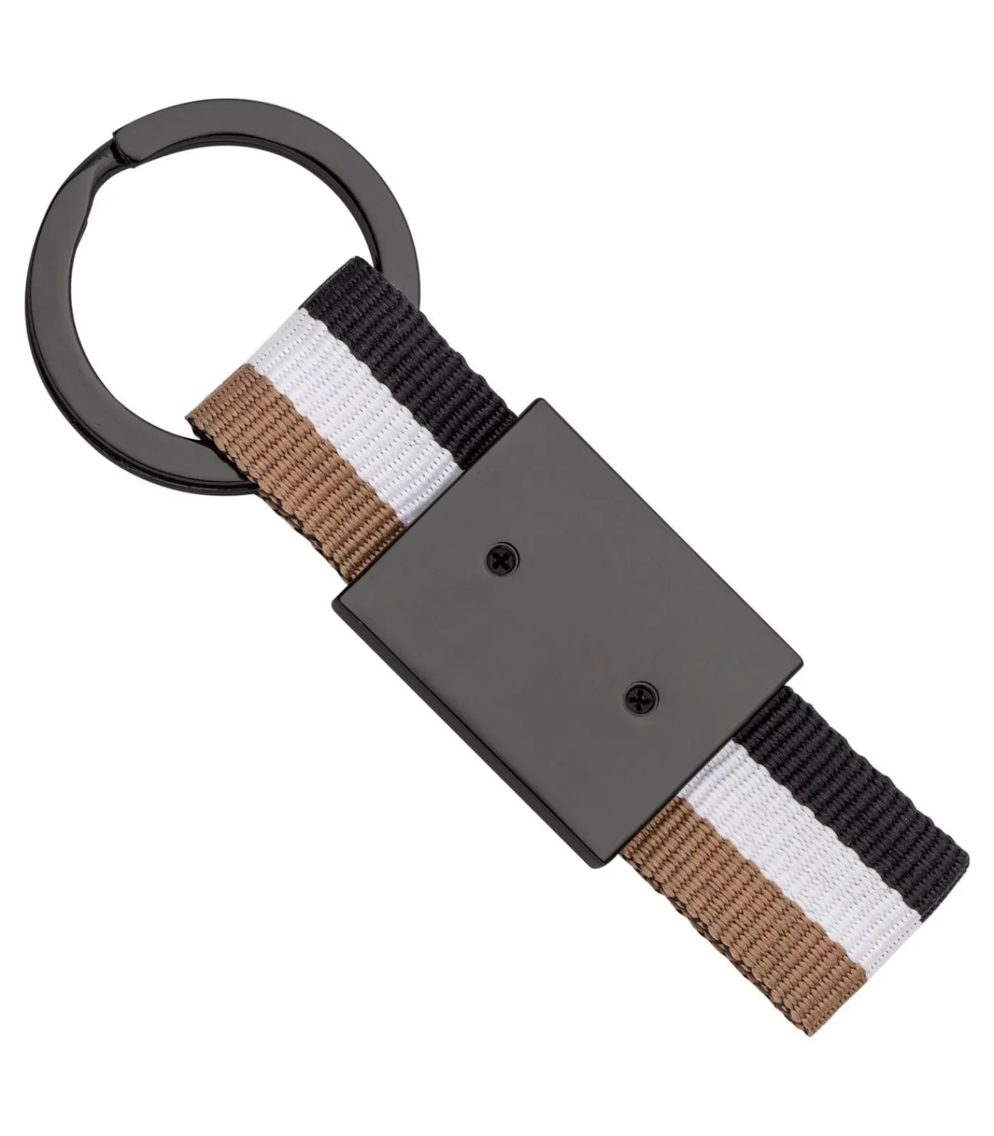 Deze sleutelhanger is ontworpen om de nieuwe HUGO BOSS branding en hun grafische & moderne iconische 3 kleuren strepen te vieren. De kenmerkende driekleurige band wordt versterkt door luxe donkerchromen metalen accenten, waardoor de alledaagse benodigdheden worden omgezet in moderne & ingetogen accessoires. Dimensions: 25 x 8 x 75/RING:32 mm, Material: 40% Zinc alloy,30% Polyester,30% Iron