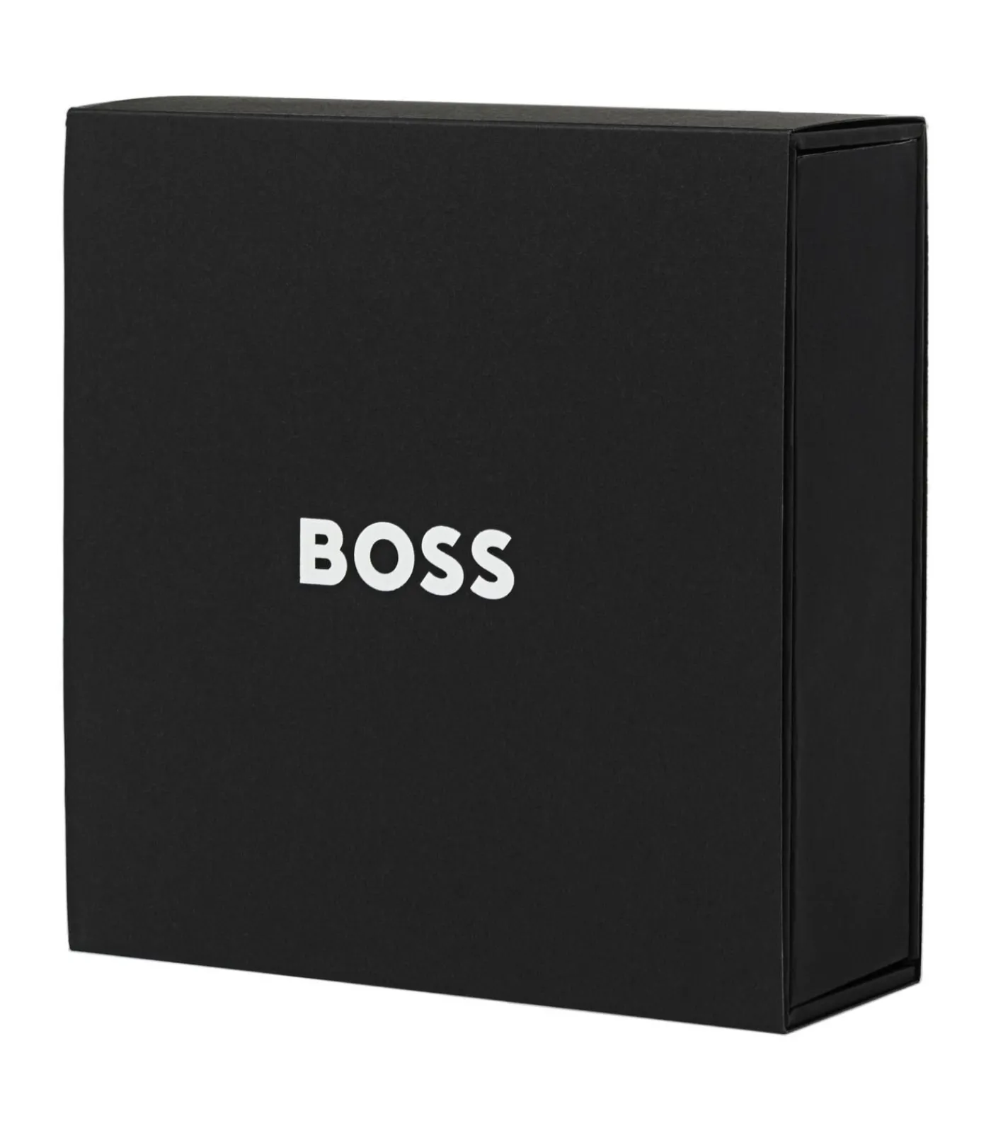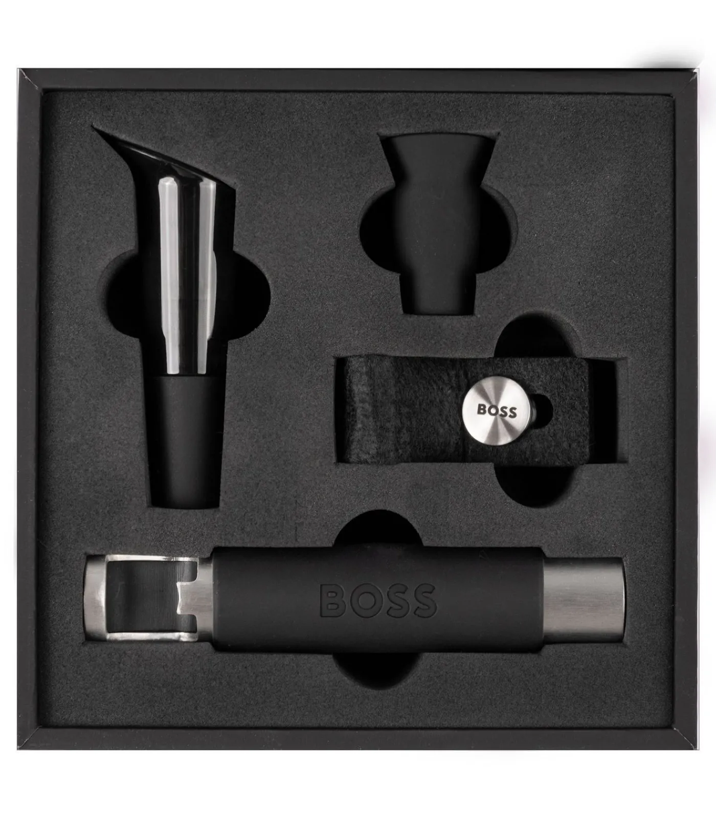 Een luxe cadeau–idee, onze nieuwe Iconic wijnset is vervaardigd uit zacht rubber en vilt enerzijds en zwaar geborsteld staal anderzijds. De prachtig bewerkte wijnset is duurzaam en wordt geleverd in een luxe BOSS–doos. Samenstelling van de sommelier set: – Geborsteld stalen hefboomkurkentrekker – Met rubber beklede flessenstop – Vilten druppelring – Machinewasbare wijnbeluchter Dimensions: DIA.15.5/STRAP:15 mm, Material: Stainless steel
