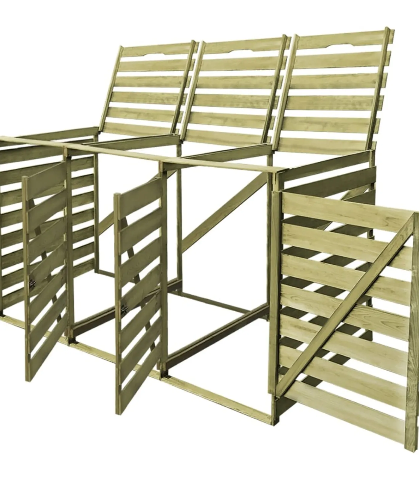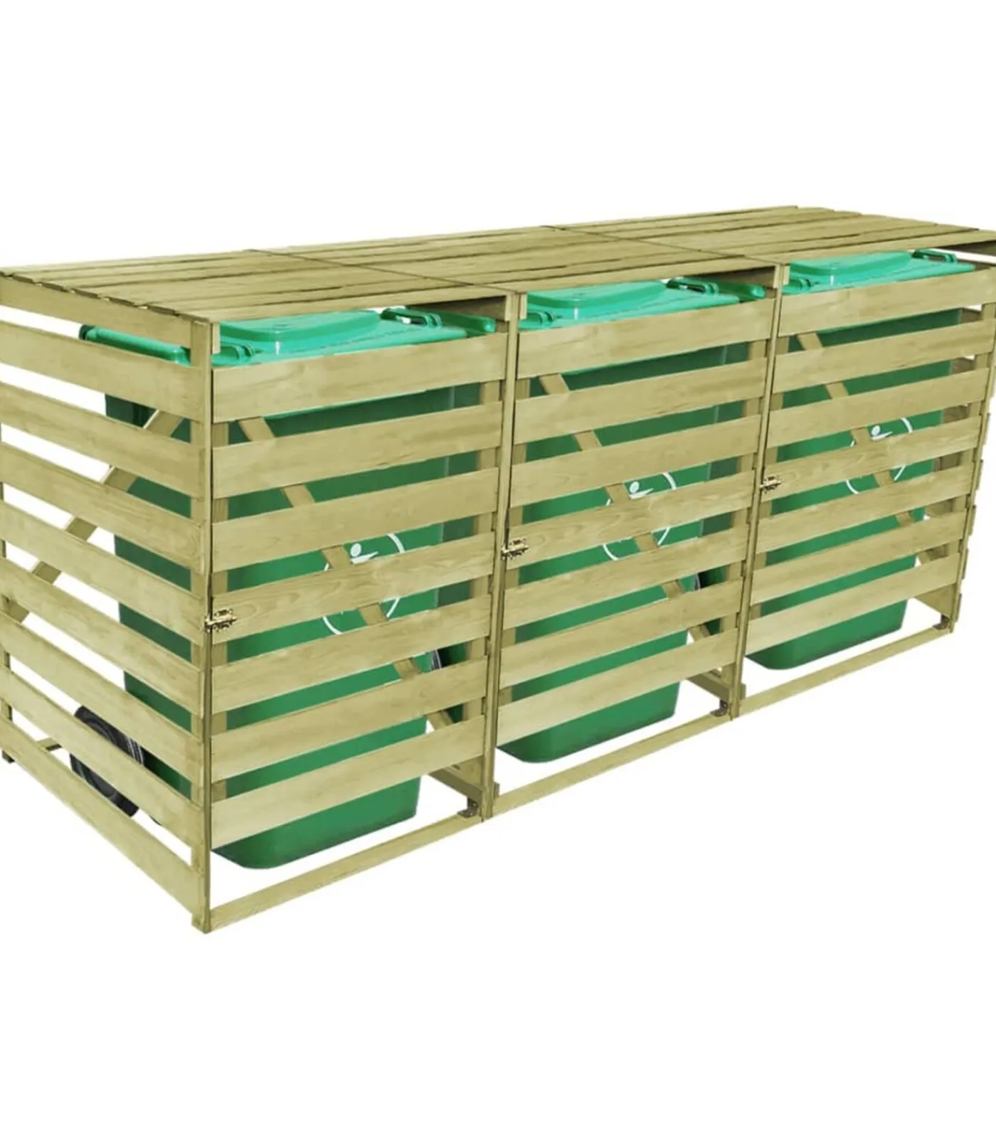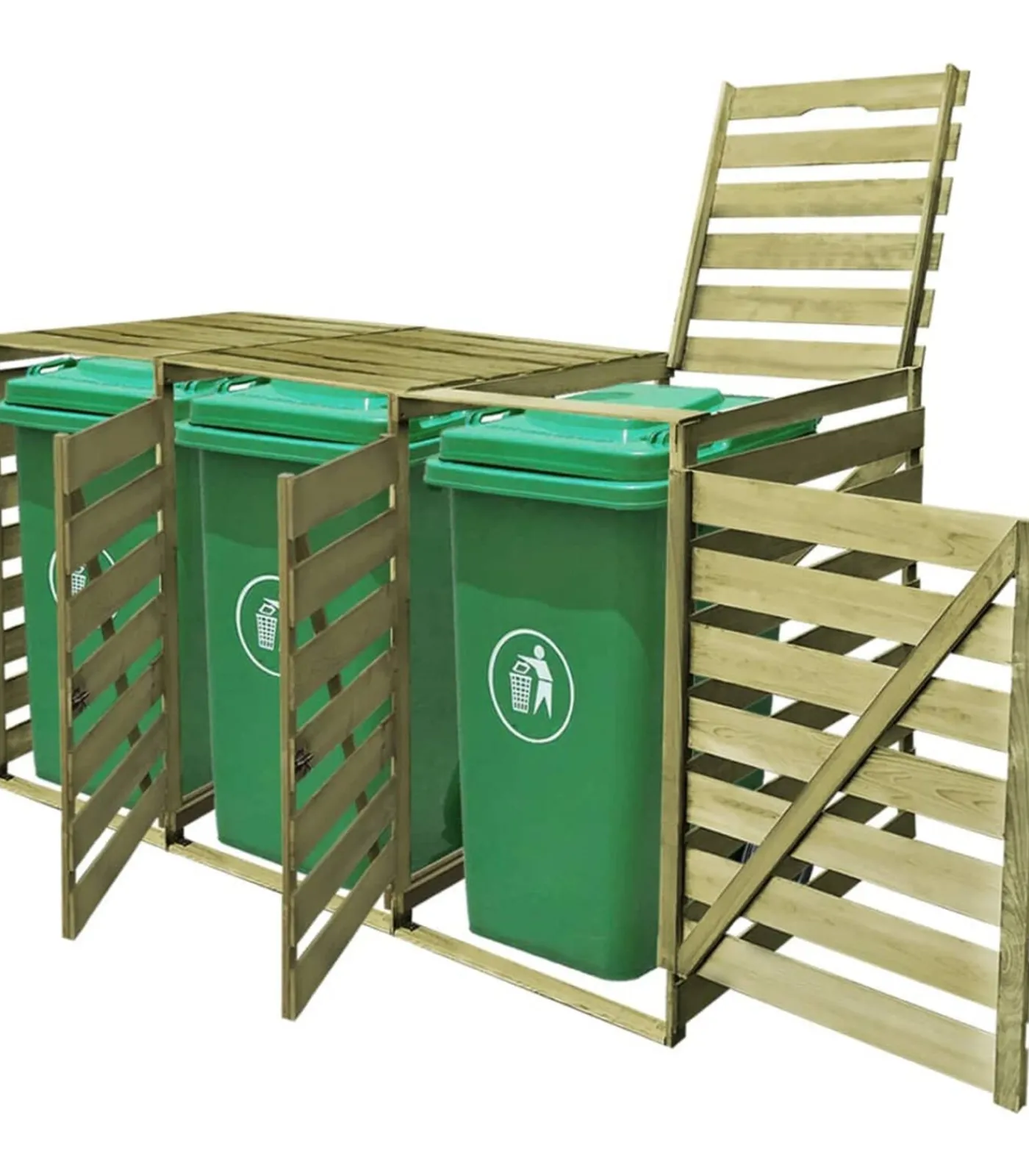 Deze containerberging is zeer stevig, duurzaam en rotbestendig, doordat hij gemaakt is van groen geïmpregneerd grenenhout. De opslagruimte is geschikt voor 3 vuilnisbakken van 240 L (met een maximale hoogte van 115 cm) en past mooi in elke tuin. Opmerking: Let op: containers worden niet meegeleverd.