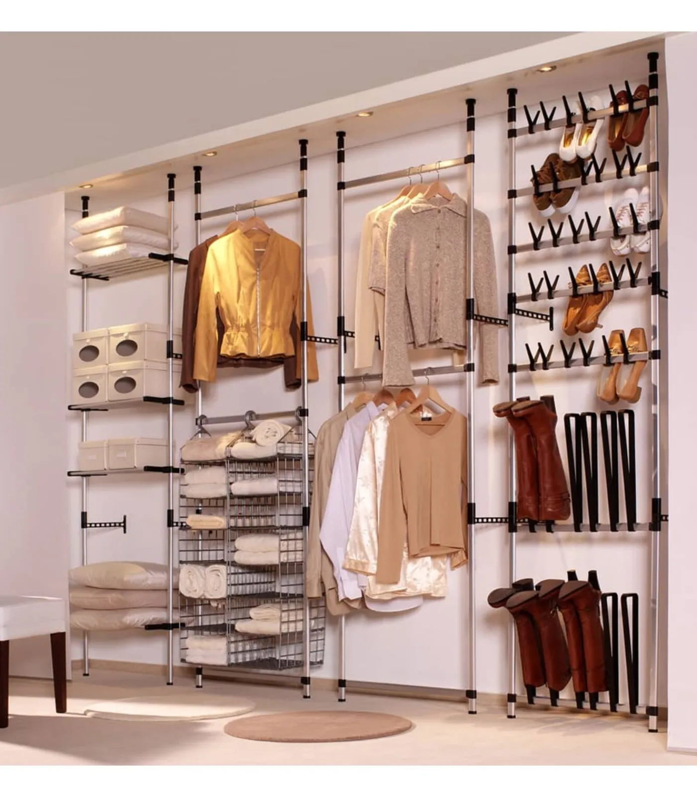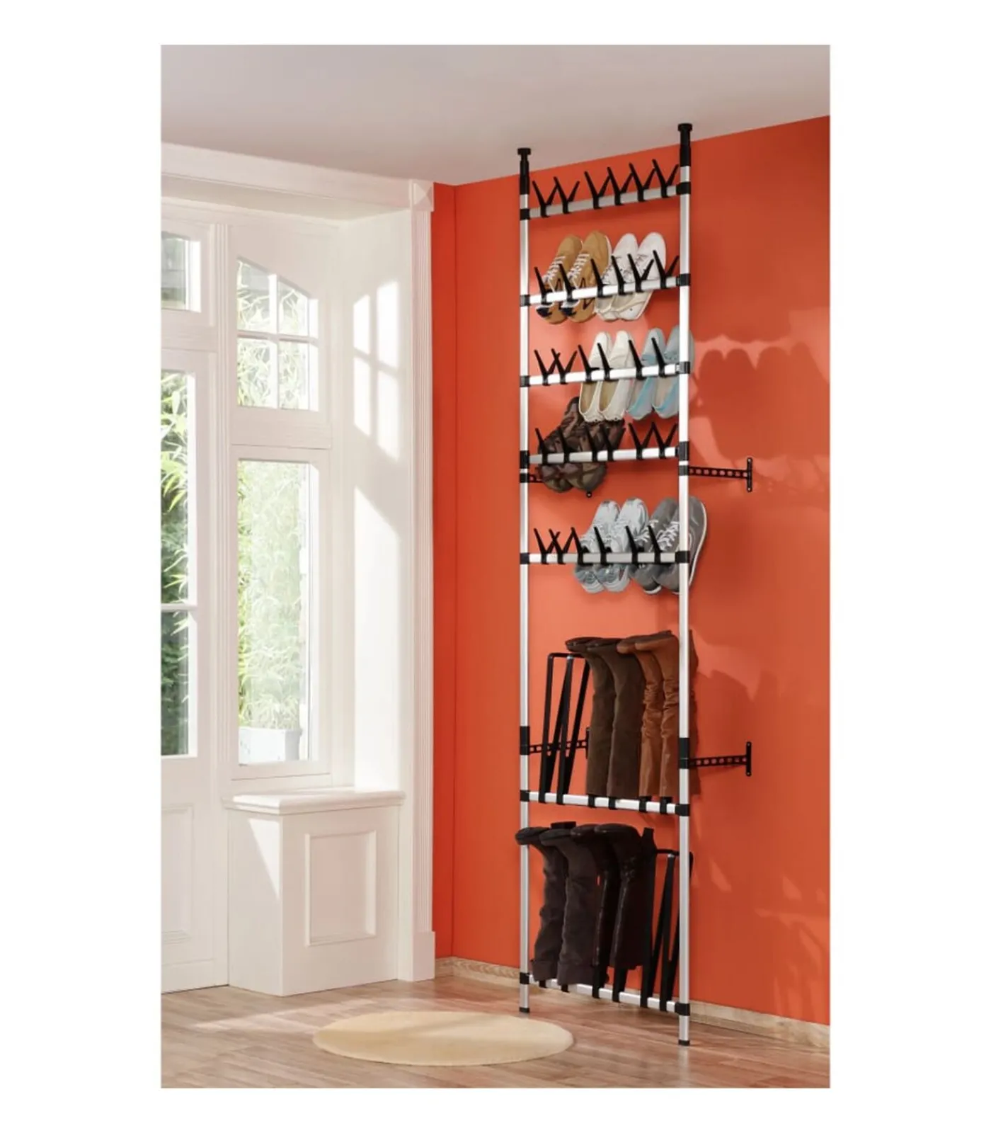 Het telescopische schoenenrek is gemaakt van aluminium, waardoor het sterk en stevig is. Dit opbergrek kan worden aangepast aan verschillende ruimtelijke opstellingen, dankzij het telescopische systeem en de verstelbare hoogte. Het systeem biedt een unieke en veelzijdige manier om schoenen te organiseren en ruimte te besparen.