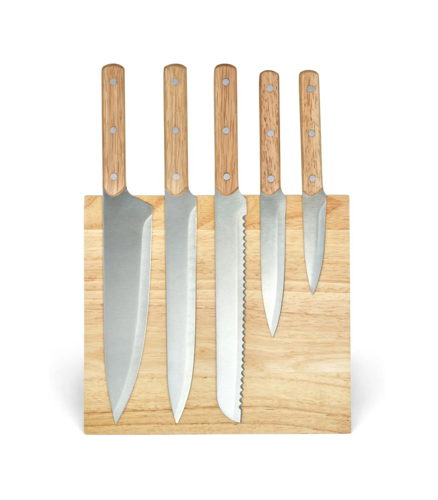 1 magnetische rubbertribune met mobiele voet, 1 snijmes 32,5 cm, 1 broodmes 32,5 cm, 1 koksmes 32,5 cm, 1 snijmes 24 cm, 1 schilmesje 20 cm, Roestvrij stalen lemmet, Rubbertree handvat en 3 klinknagels