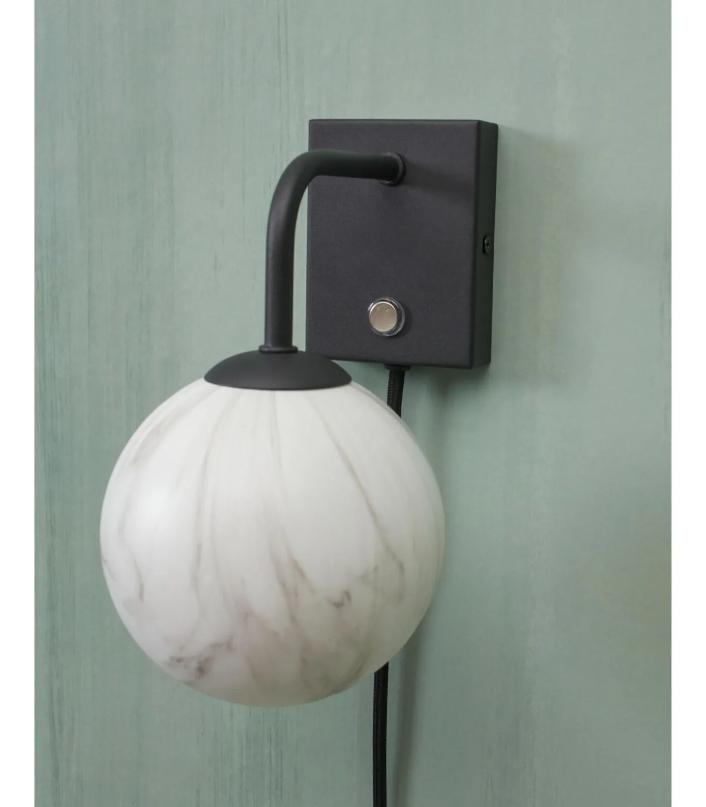 Deze chique mooi verlichte Carrara wandlamp heeft een witte glazen bol met marmer print. Het frame is van metaal met een matte zwarte afwerking. Met een touch knop op het frame zou hij perfect zijn naast uw bed of bank. De afmeting is 12x18x21cm.