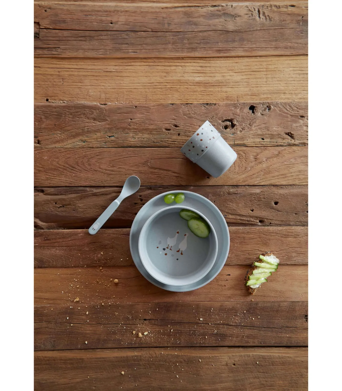 De Tiny Farmer maaltijdset met zachte schapen en waggelende ganzen nodigt kleine fijnproevers uit om aan tafel kennis te maken met de natuur.De set bestaat uit een bord, kom, beker en lepel. De set bestaat uit een bord, kom, beker en lepel, en een antislip siliconen ring aan de onderkant om ervoor te zorgen dat het servies op zijn plaats blijft.Het kinderservies is BPA–vrij, zeer licht en vaatwasmachine– en magnetronbestendig. Het is gemaakt van een mengsel van polypropyleen en cellulose, zodat het duurzamer is en bij de productie ervan zuiniger met hulpbronnen omgaat dan conventioneel polypropyleen. Het bord, de kom, de beker, de lepel en de oefenbeker met twee handvatten en een tuit zijn afzonderlijk verkrijgbaar.