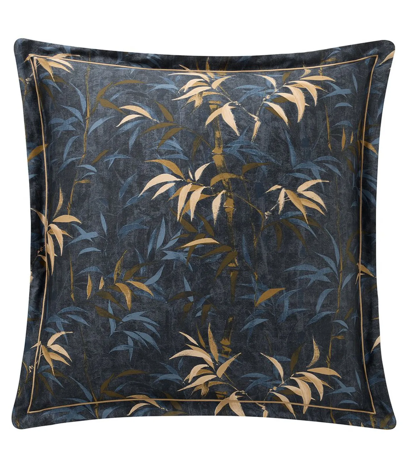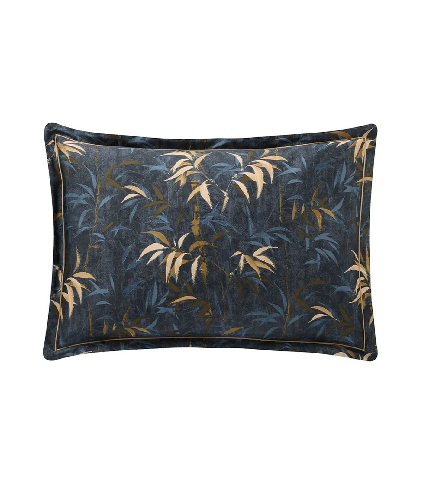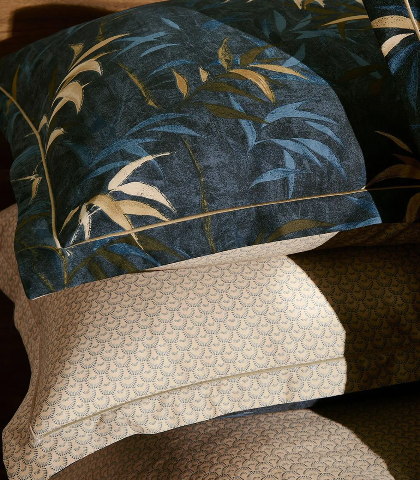 Bamboeprint in blauw en goudbeige op een nachtblauwe achtergrondNachtblauwe palmettenprint op goudbeige achtergrond