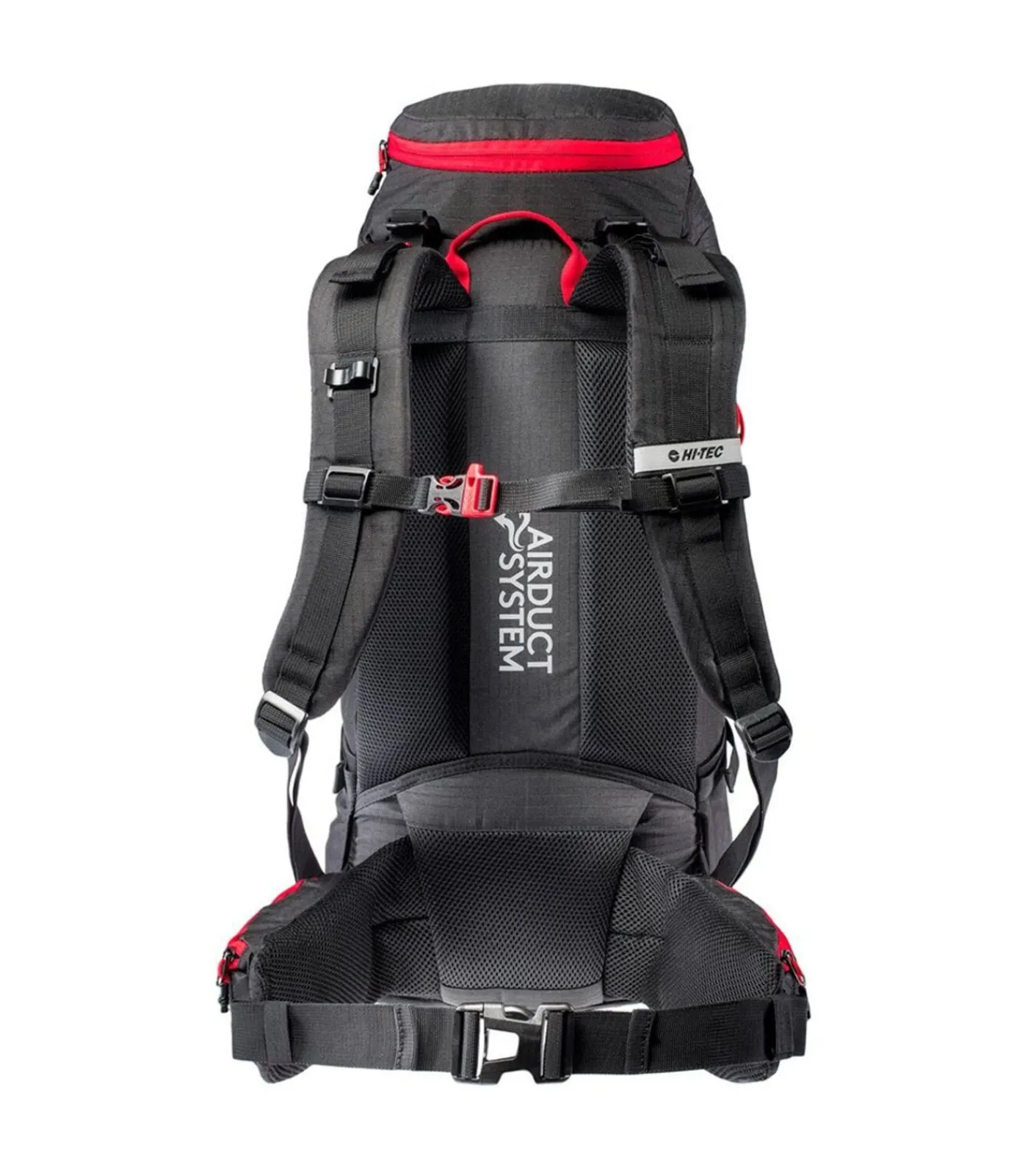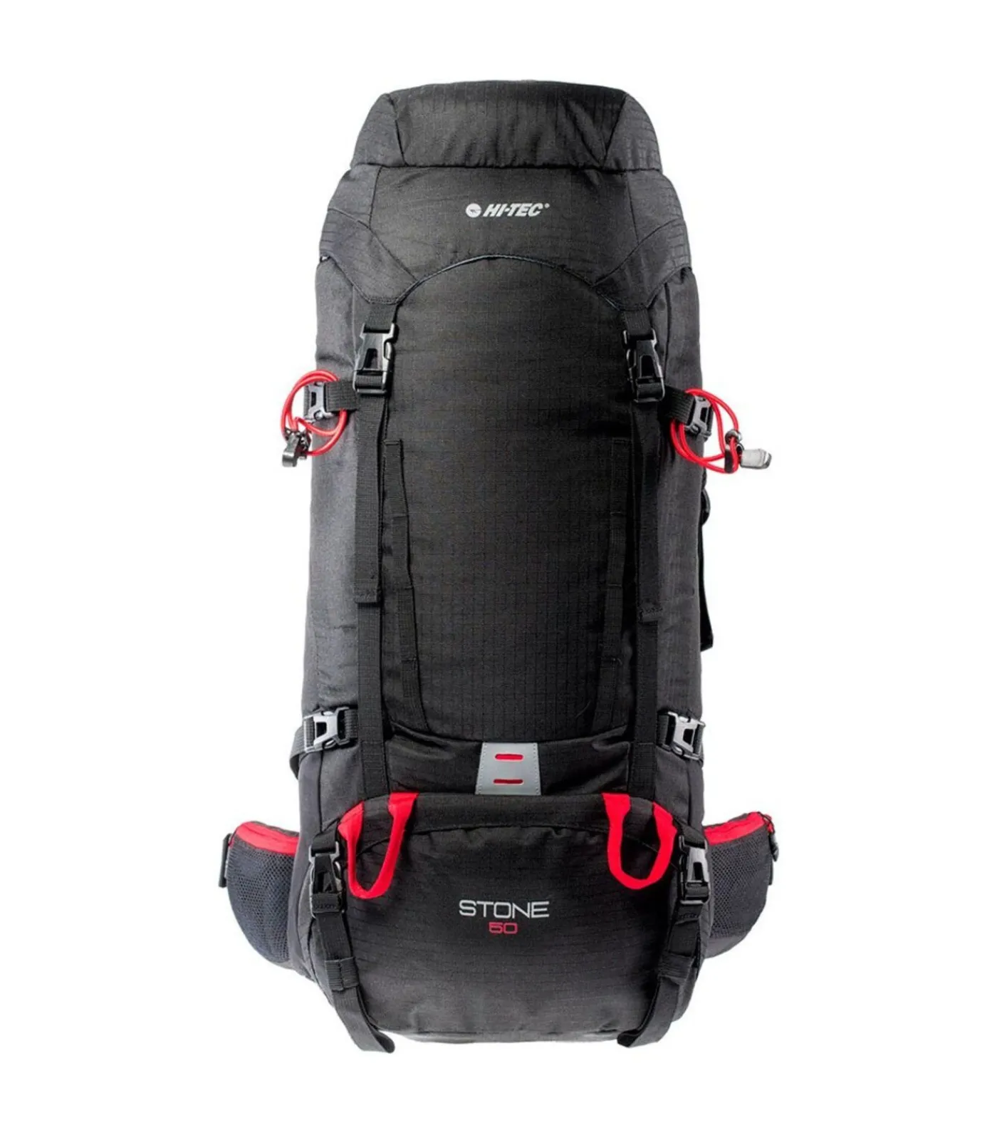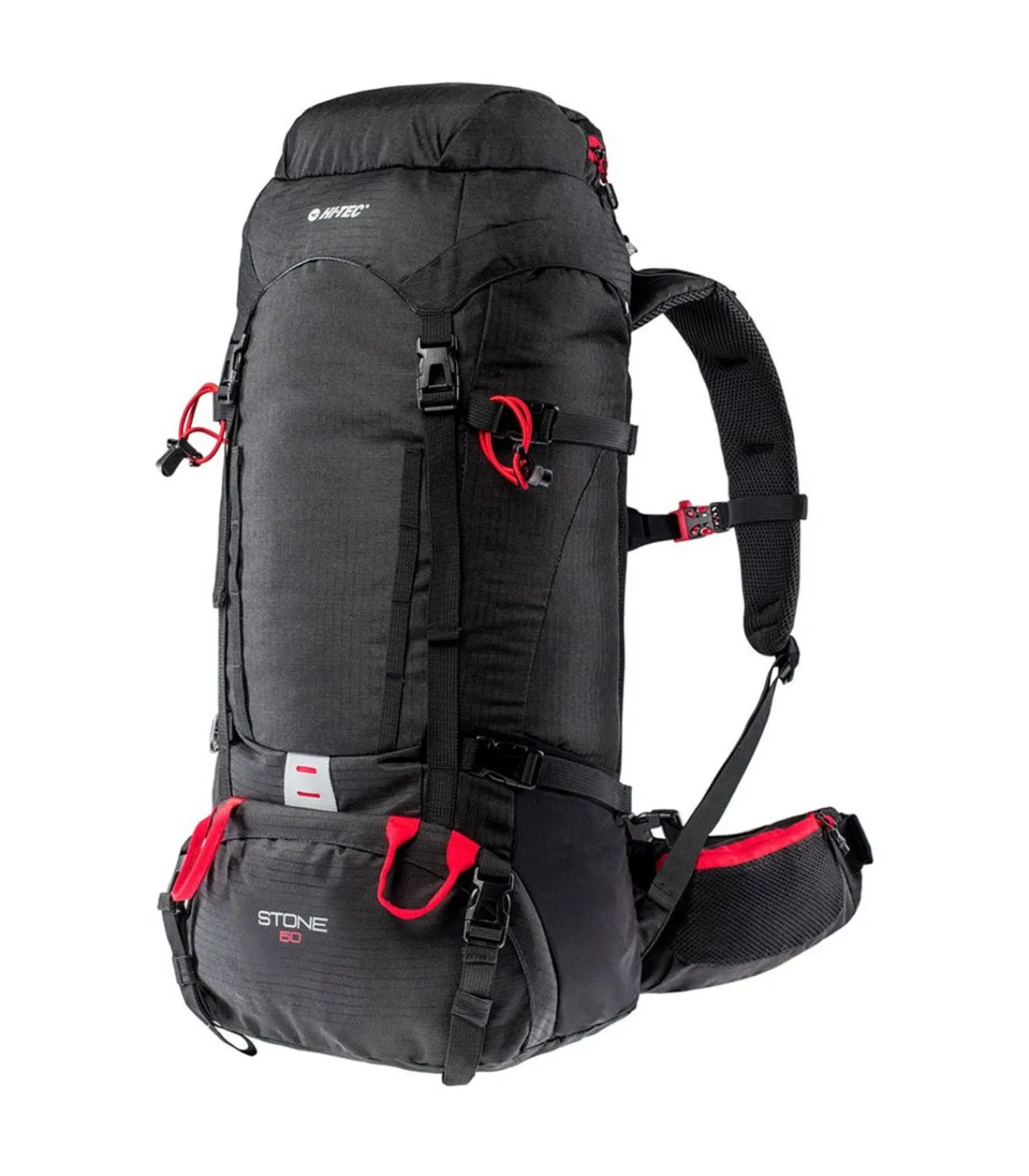 Productspecificaties: Naam: Hi–Tec Unisex Adult Stone Hiking rugzak Materiaal: 100% polyester stof met een PU–coating. Afmetingen: 64cm in lengte, 29cm in breedte, 24cm in hoogte. Ontwerpkenmerken: Voorzien van het merklogo en tekst. Sluit met een klinksluiting. Met verstelbare riem en ergonomische ruggensteun. Accessoires: Wordt geleverd met een regenhoes. Reflecterende details. Het geventileerde ontwerp zorgt voor luchtstroom. De brede opening biedt gemakkelijke toegang. Compartimenten: Bevat een voorvak, een bodemvak en een zijvak. Zakken: Met paspelzakken. Capaciteit: Biedt plaats aan 50 liter uitrusting. Kenmerken: Duurzaam en lichtgewicht voor trektochten en buitenactiviteiten.