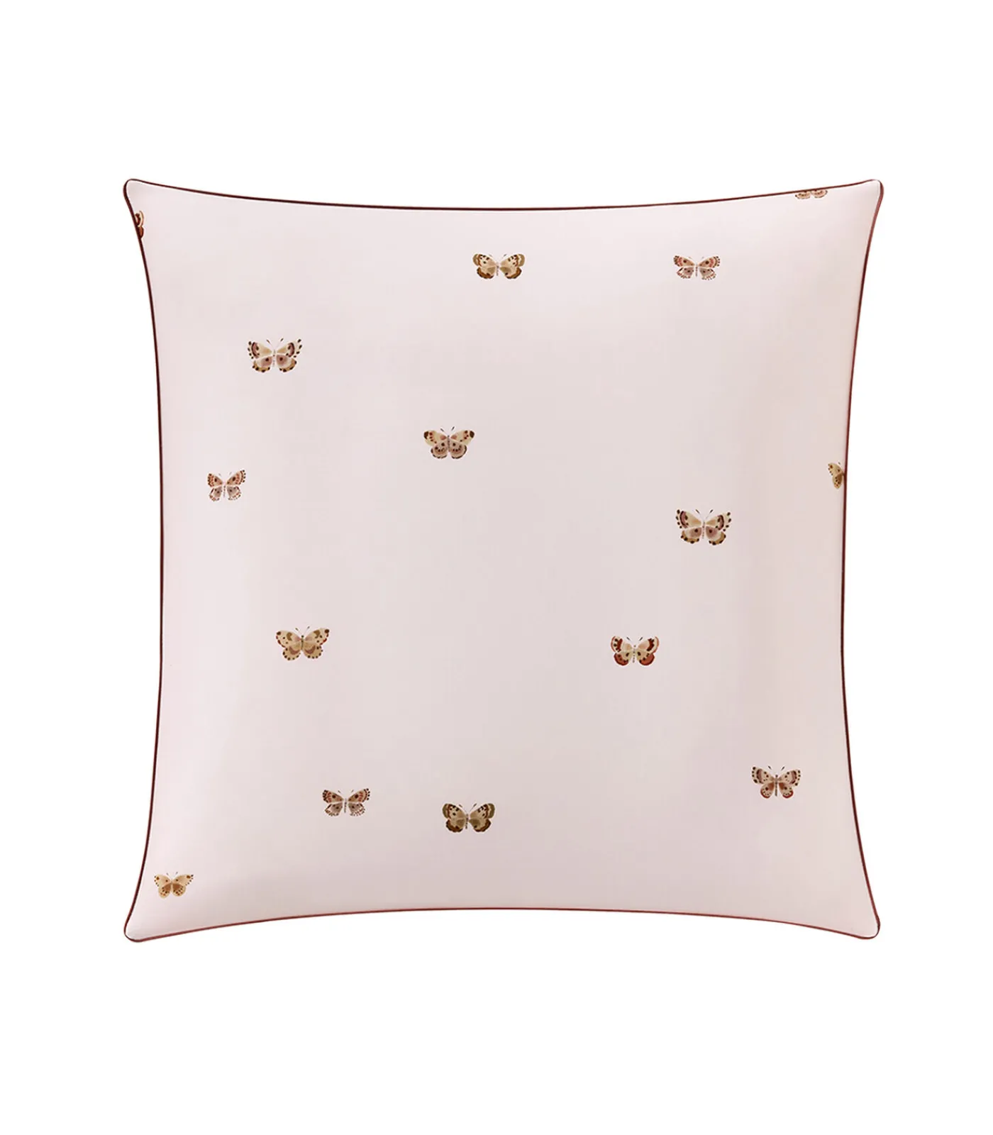 Geef uw dagelijks leven een vleugje poëzie met ons Délicatesse–model. Deze kussensloop heeft een betoverend ontwerp met een groot aantal vlinders die rond lijken te fladderen in een fraai, verfijnd ballet. Dit met gouache geschilderde ontwerp in roze tinten wordt versterkt door een achterkant met bruinroze strepen, wat een subtiel vleugje verfijning toevoegt. De verfijnde bies rondom de kussensloop rondt deze harmonieuze look af en creëert een rustgevend geheel. Laat u verleiden door de natuurlijke schoonheid en elegantie van ons Délicatesse bedlinnen, ontworpen om uw slaapkamer te veranderen in een poëtische oase van rust.