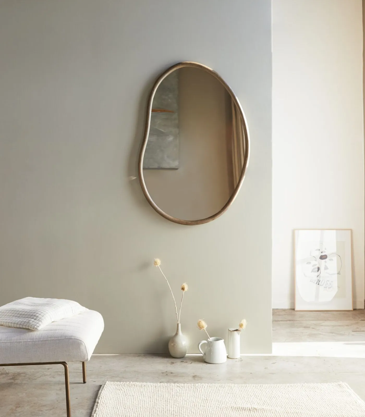 Elegant en design, de spiegel van massief mindi Dim. Deze zeer visuele en grote spiegel speelt met de vervorming van de rondingen. Een echt decoratief element op zichzelf, fleurt elke kamer in huis op.
