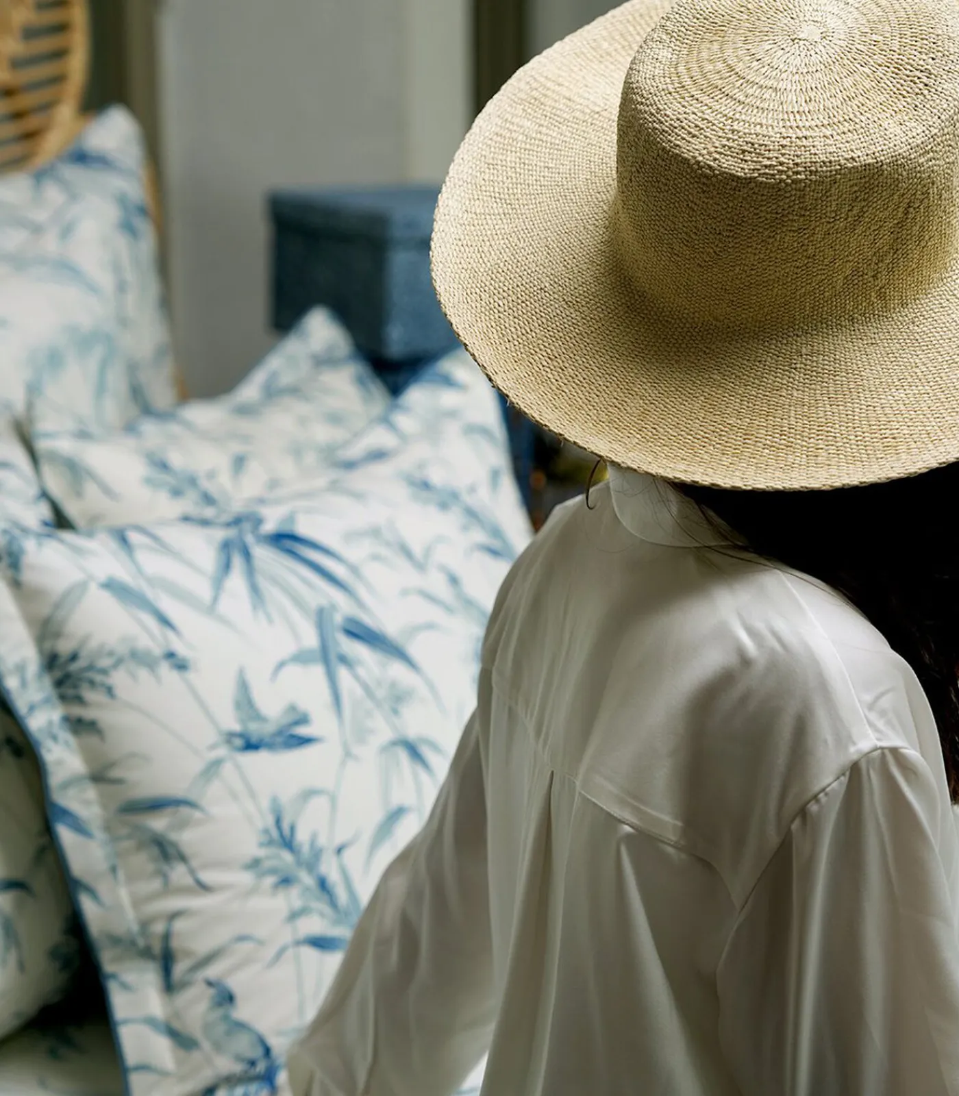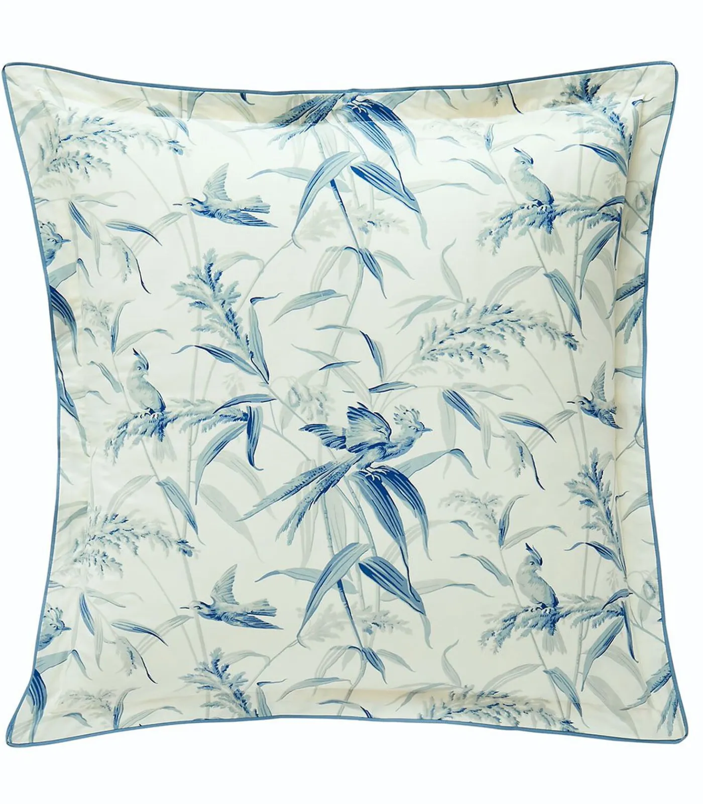 Bedrukking van blauwe planten en parkieten op een ivoorkleurige achtergrond.Keerzijde bedrukt met blauwe planten op een ivoorkleurige achtergrond.Sloop met platte volant van 3 cm.Afwerking met een fijn blauw biaisband.