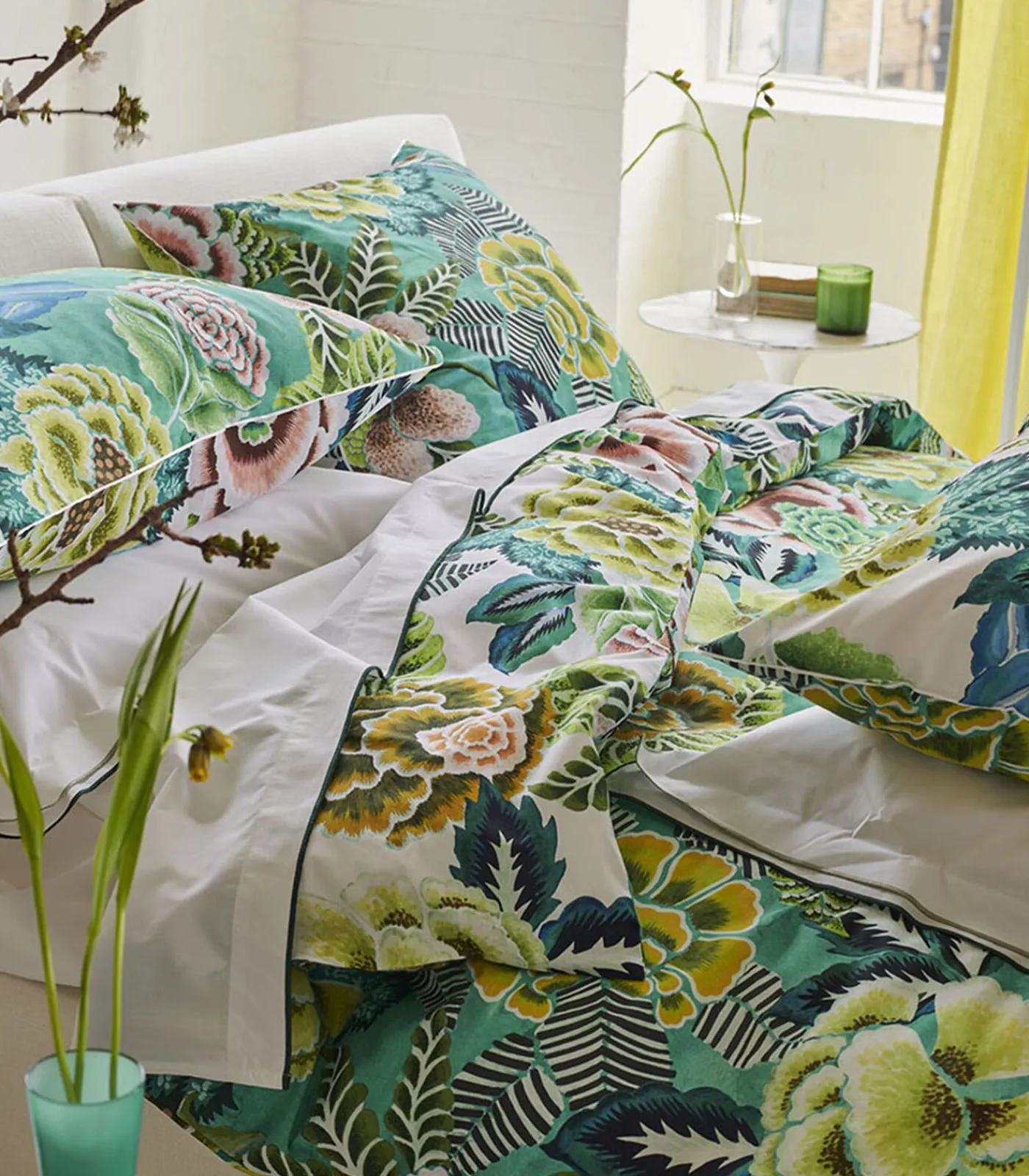 Het model Rose de Damas is geïnspireerd op de tijdloze schoonheid en betoverende geur van Damascusrozen, in een moderne interpretatie. De handgeschilderde bloemen worden gepresenteerd in een zacht palet van blauw, groen en geel, wat een elegante en rustgevende sfeer creëert. Dit omkeerbare ontwerp maakt het gemakkelijk om de sfeer van uw slaapkamer naar wens te veranderen en brengt een beetje frisheid en verfijning in uw slaapvertrek. Over elk detail is zorgvuldig nagedacht, zoals het witte lint rond de kussensloop, dat zorgt voor een geraffineerd accent.