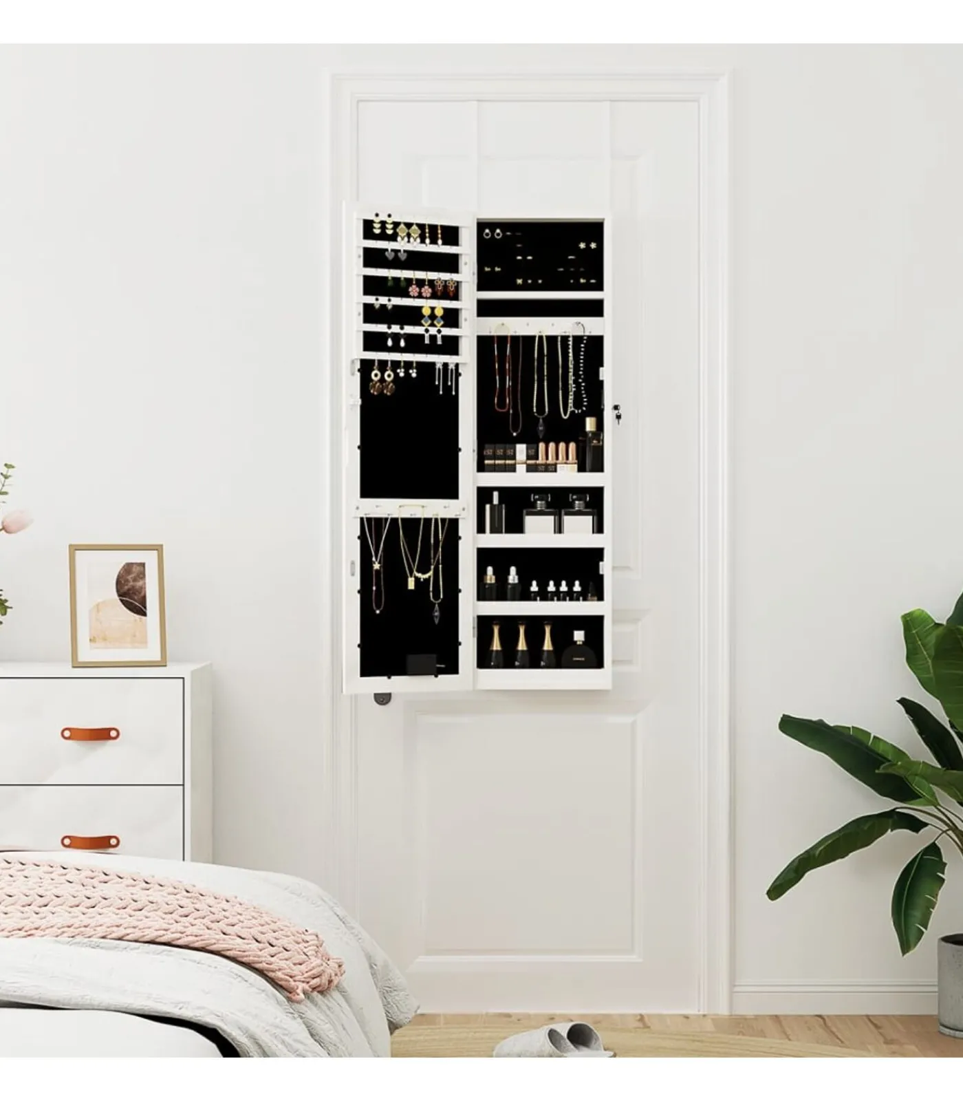 Voldoende opbergruimte: de spiegel met opbergruimte heeft veel haakjes, hangers en plankjes om je sieraden netjes geordend en binnen handbereik te houden.