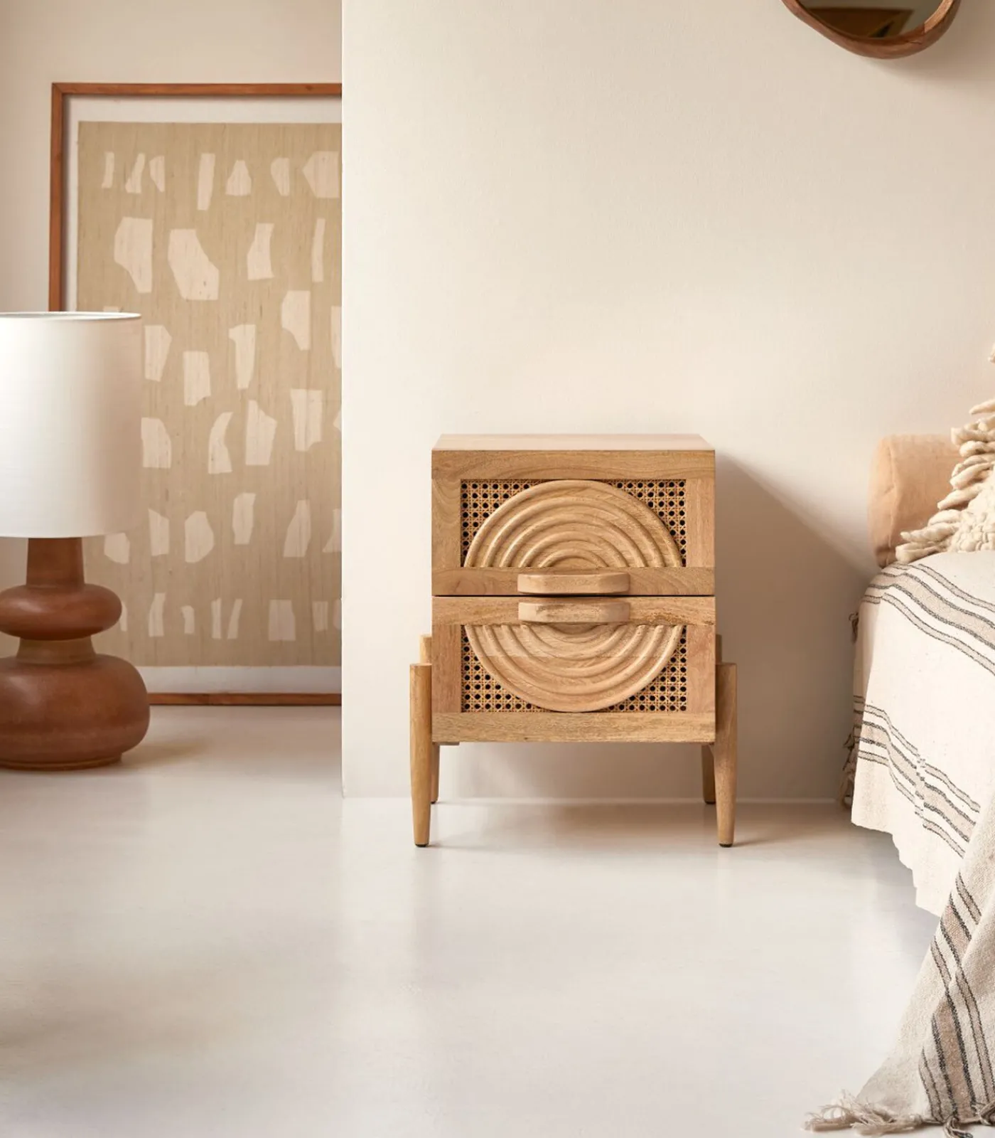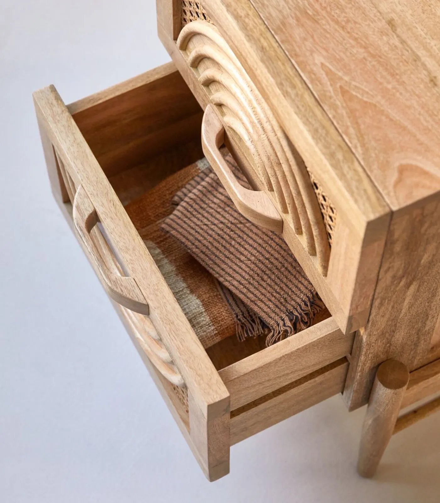 Het nachtkastje Sina van massief mangohout en rotan is gelakt voor veel dagelijks gebruiksgemak.