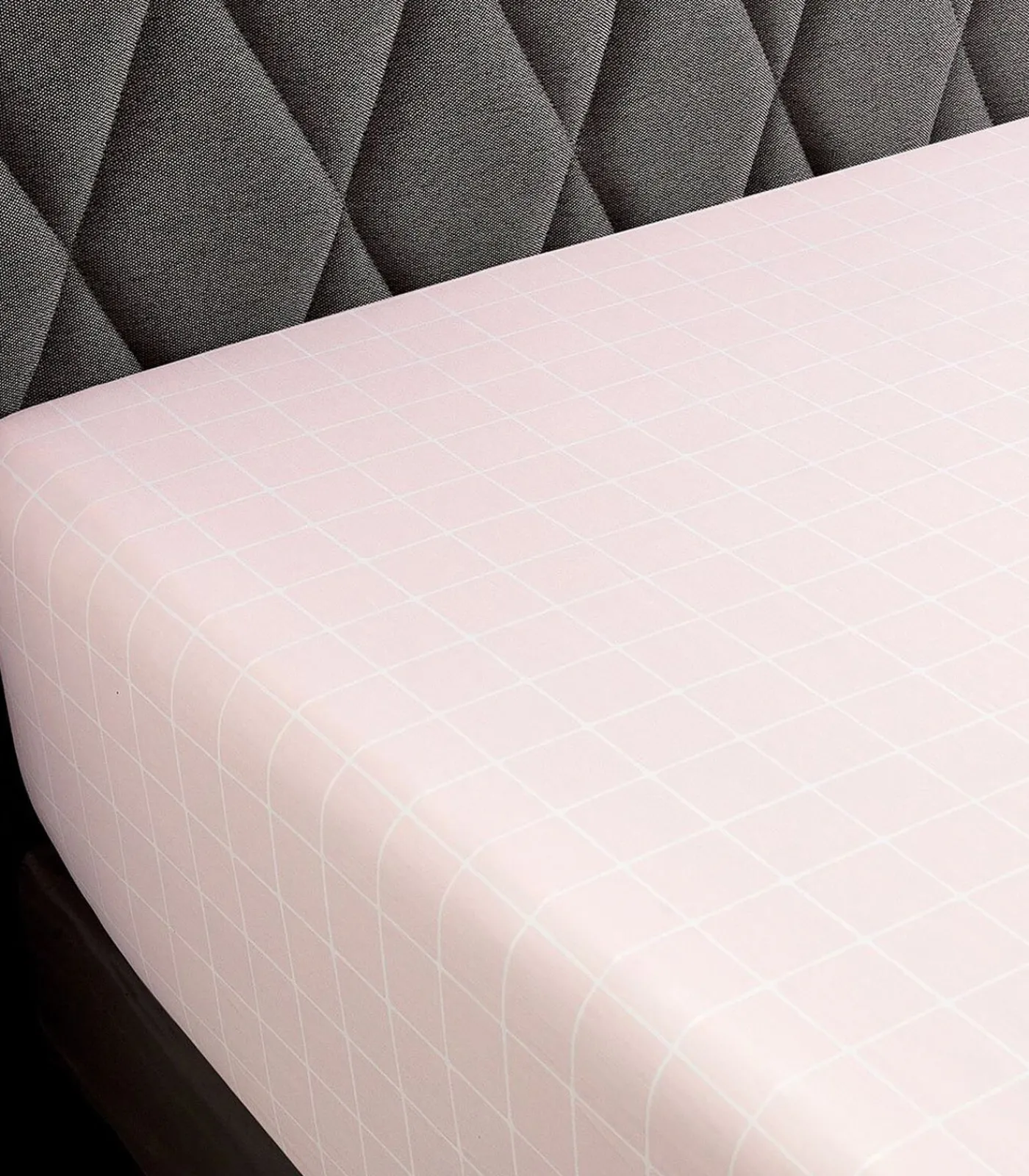 Bedrukking van ruitjes op een lichtroze achtergrond.Hoeslaken met een hoogte van 35 cm