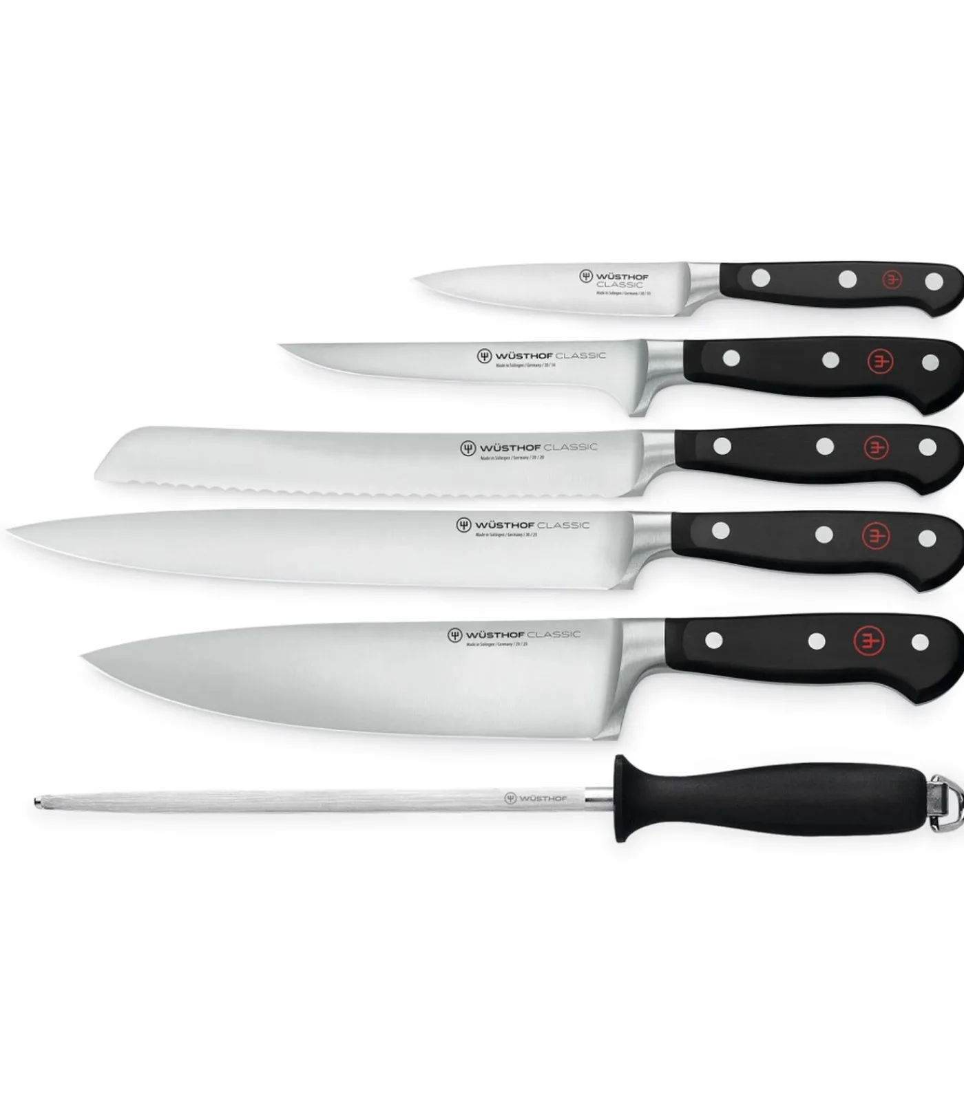 Ben jij een fan van koken en sta je regelmatig in de keuken? Dan mag de Wusthof Messenset Classic 6–Delig niet ontbreken in jouw keuken! Deze messen zijn perfect voor een echte hobbykok. Na het gebruiken van de messen kunnen deze het beste met de hand worden gereinigd. De Wusthof Messenset Classic 6–Delig bestaat uit:1 x Officemes Classic 10 cm1 x Broodmes Classic 20 cm1 x Vleesmes Classic 23 cm1 x Koksmes Classic 20 cm1 x Uitbeenmes1 x Aanzetstaal