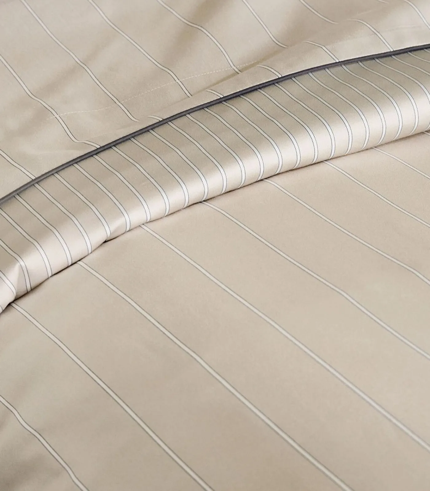 Bedrukking van brede verticale strepen op een grègekleurige achtergrond.Bies van 8 cm.Afgewerkt met een grijze paspel.