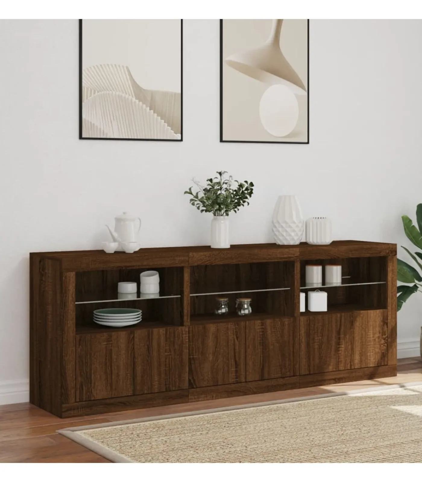 RGB LED–verlichting: het dressoir is voorzien van levendige RGB LED–verlichting. Dankzij verschillende aanpasbare menu’s kun je de kleur van de verlichting moeiteloos wijzigen en deze zelfs instellen zodat hij automatisch verandert. Deze LED’s versterken de moderne en trendy uitstraling van het dressoir.