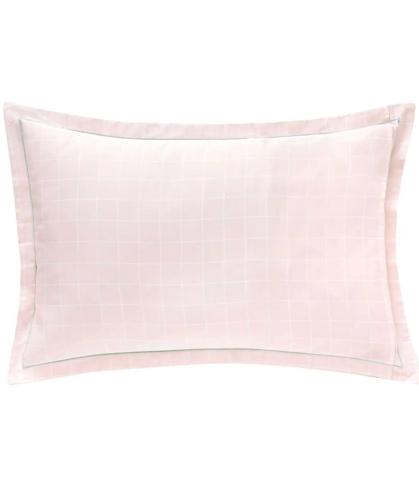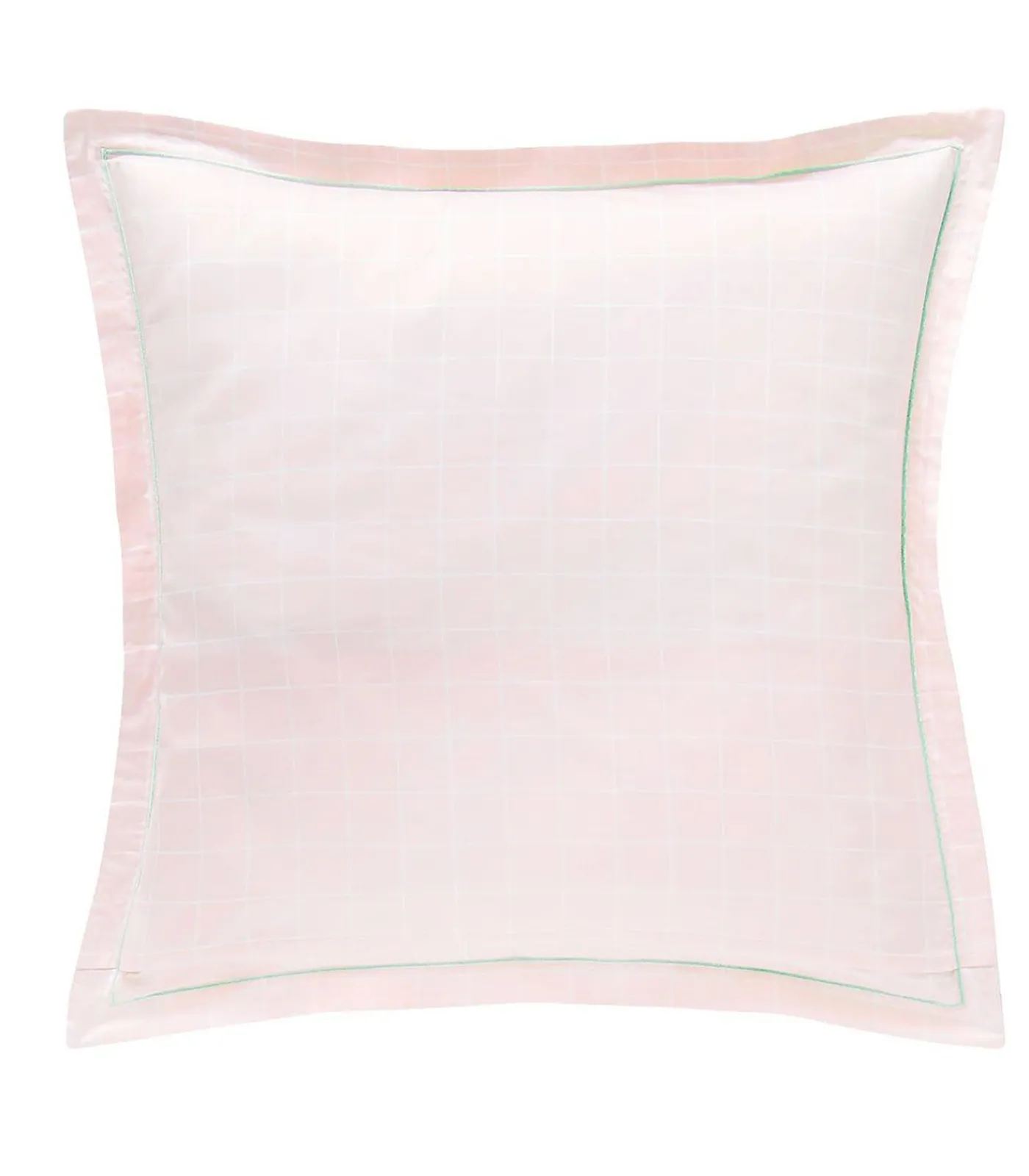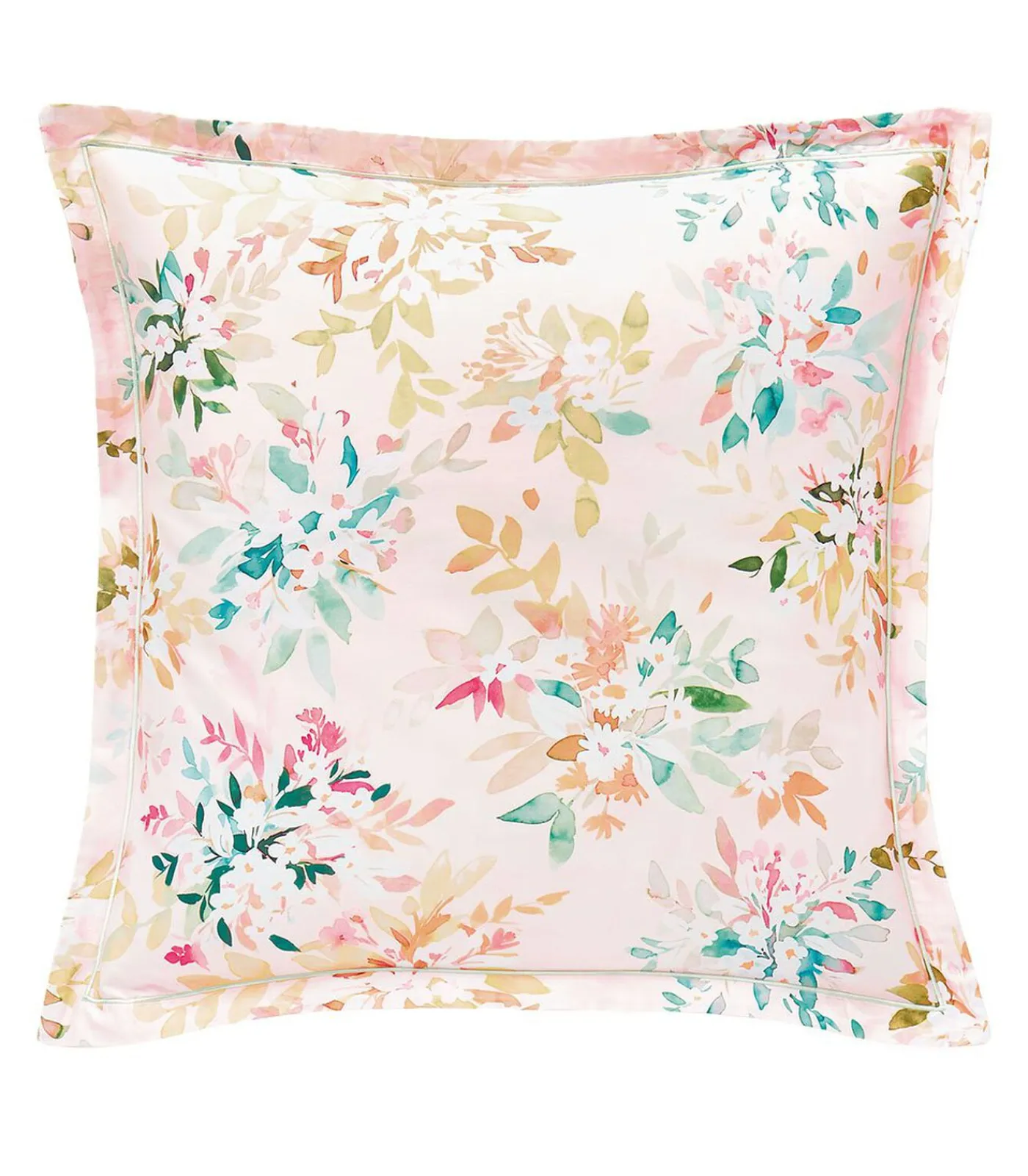 Bedrukking van aquarelbloemen op een lichtroze achtergrond.Keerzijde bedrukt met ruitjesmotief op een lichtroze achtergrond.Kussensloop met een platte volant van 3 cm.Afgewerkt met een fijne lichtgroene bourdonsteek.
